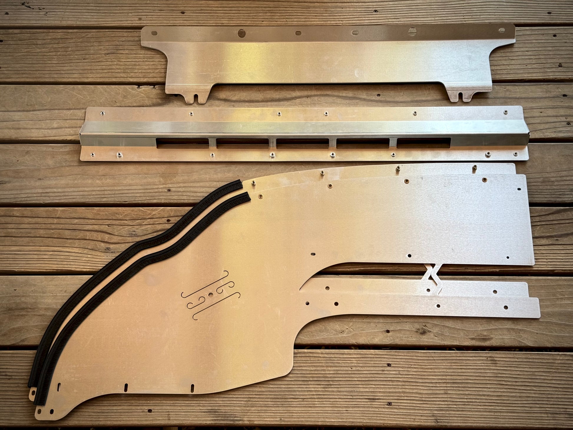 - Radiator guard now mounts to the lower radiator support instead of the skid plates, accommodating variations between skid plate designs (photos show prototype)